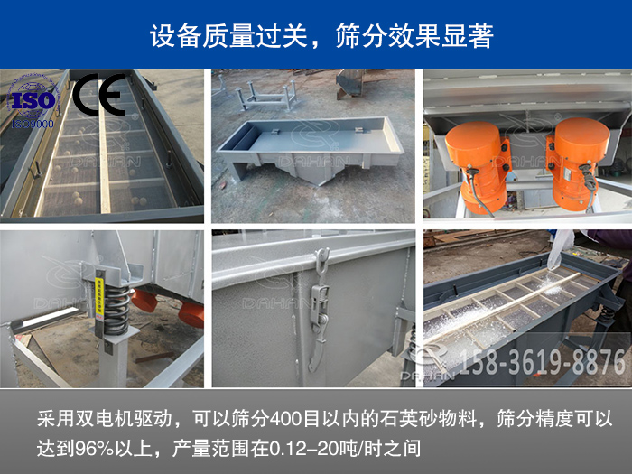 我們廠家的石英砂篩分機(jī)選用不銹鋼及碳鋼材質(zhì),板材厚度均在10-12mm之間,可以大大降低設(shè)備的磨損,延長(zhǎng)石英砂篩分機(jī)使用壽命,大漢石英砂篩分機(jī)質(zhì)量已經(jīng)通過(guò)ISO9001國(guó)際質(zhì)量體系認(rèn)證和歐盟CE認(rèn)證,我們的石英砂篩分機(jī)是完全達(dá)到不合格不出廠,用戶(hù)可以放心選購(gòu),設(shè)備可以享受7日內(nèi)換貨和15日內(nèi)退貨。